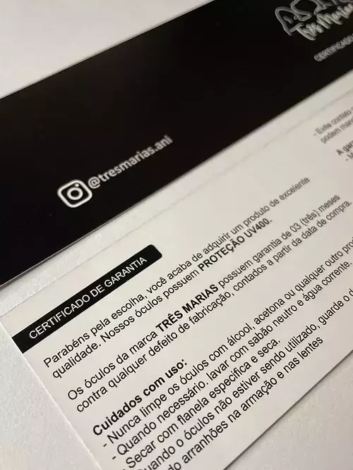 Os óculos da marca TRÊS MARIAS possuem garantia de 03 (três) meses contra qualquer defeito de fabricação, contados a partir da data de compra.